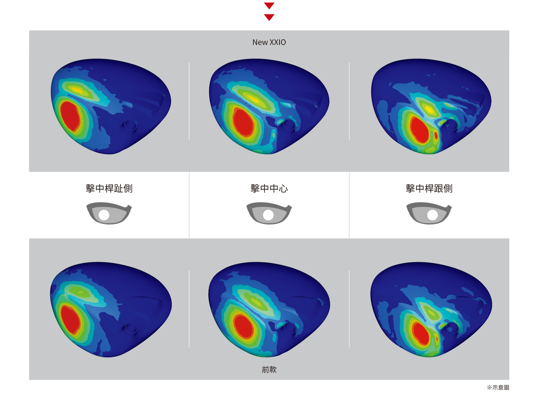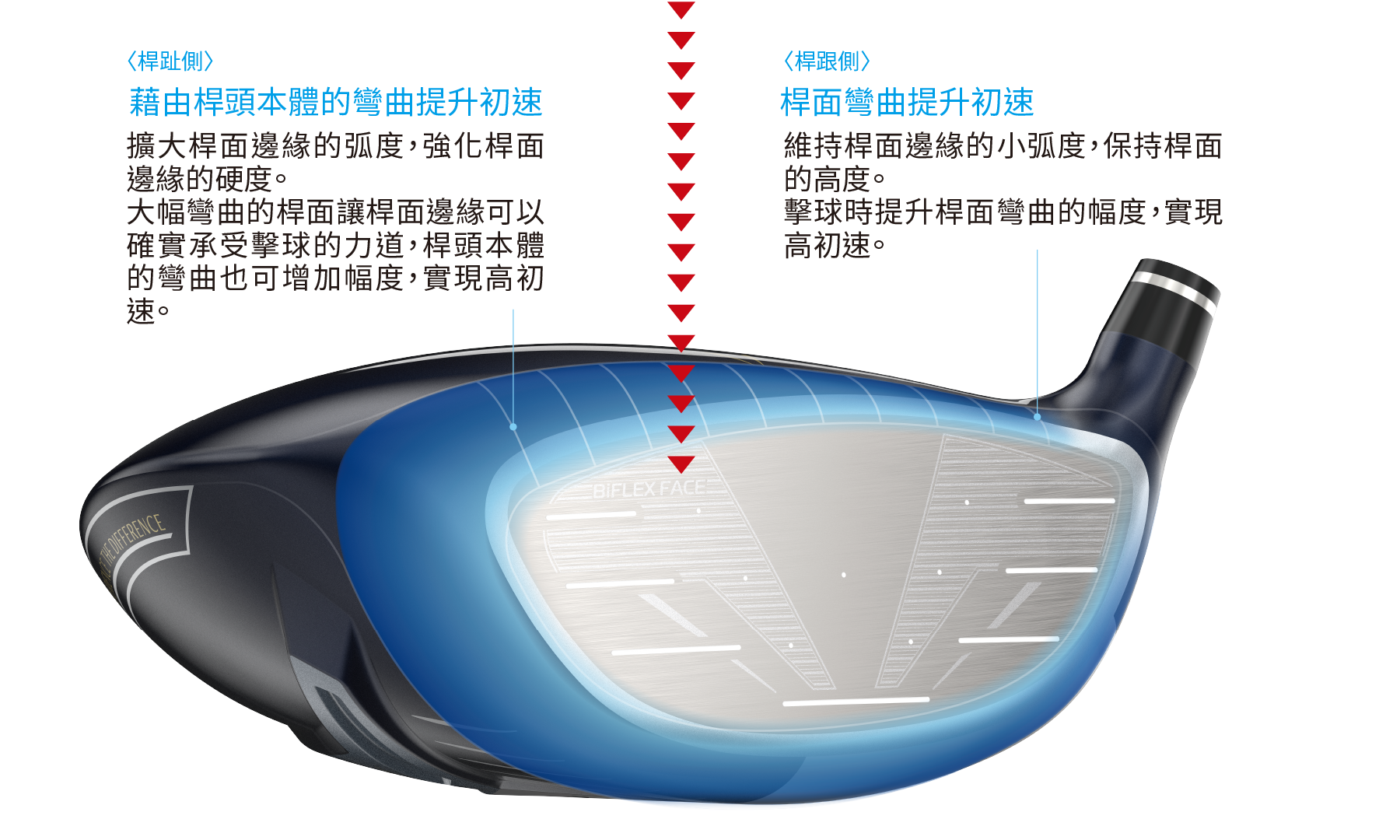 不論是從中心或是偏離中心擊球,都能擴大擊球時的桿面彎曲幅度,擴大高初速區域的新開發技術。