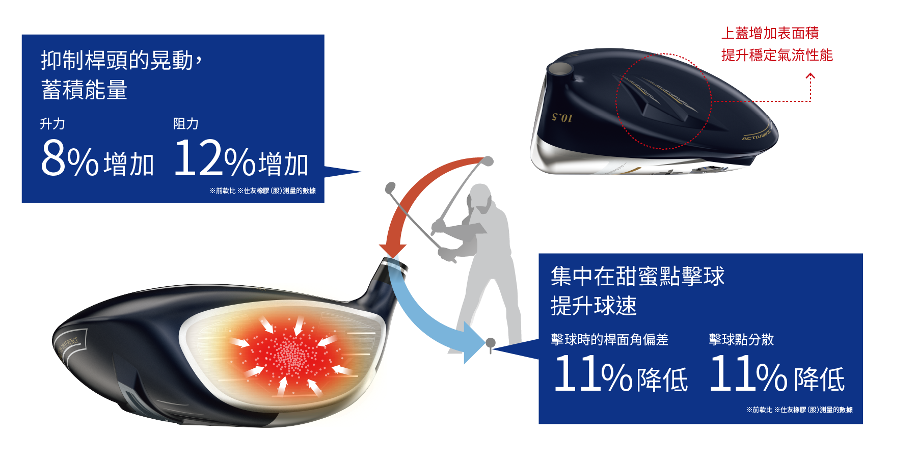 ※示意圖穩定下桿前半段的氣流(約12點→9點方向),抑制桿頭下桿時不穩的技術,提升擊球能量。全新桿頭上蓋2段式飛行翅膀,下桿擊球時更穩定。