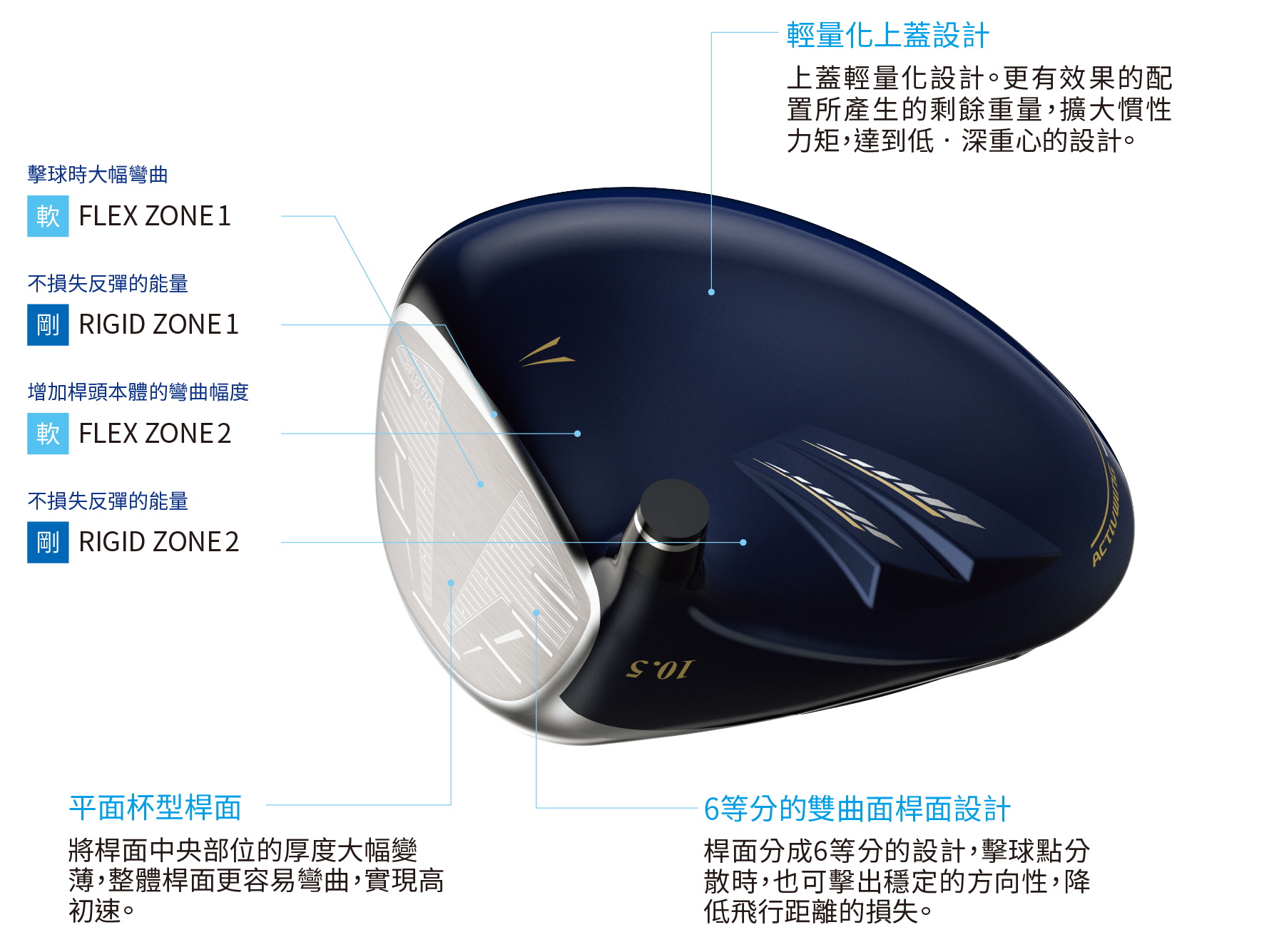 「擴大甜蜜點區域、擊球時更容易擊中甜蜜點,開球就擊出暢快人心的一擊。」