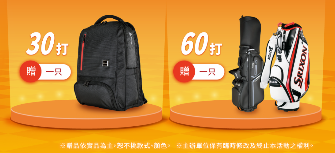 活動辦法:單筆SRIXON、XXIO指定球款,印球30打送後背包乙只,60打送桿袋乙只