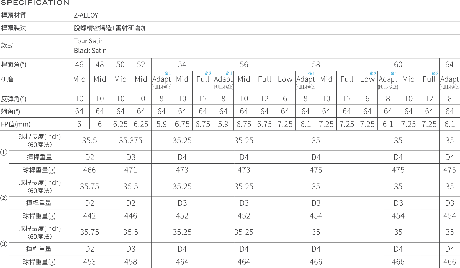 ※1:54°、56°、58°、60°、64°(Adapt)的③桿身需特注訂製。