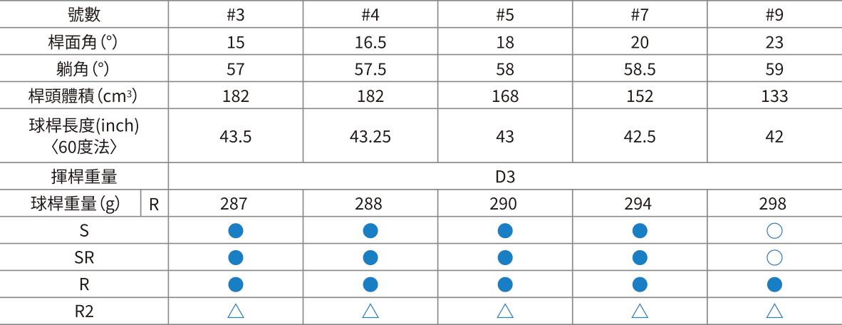 ●為一般品、△為特注訂製 ※球桿重量有可能改變。